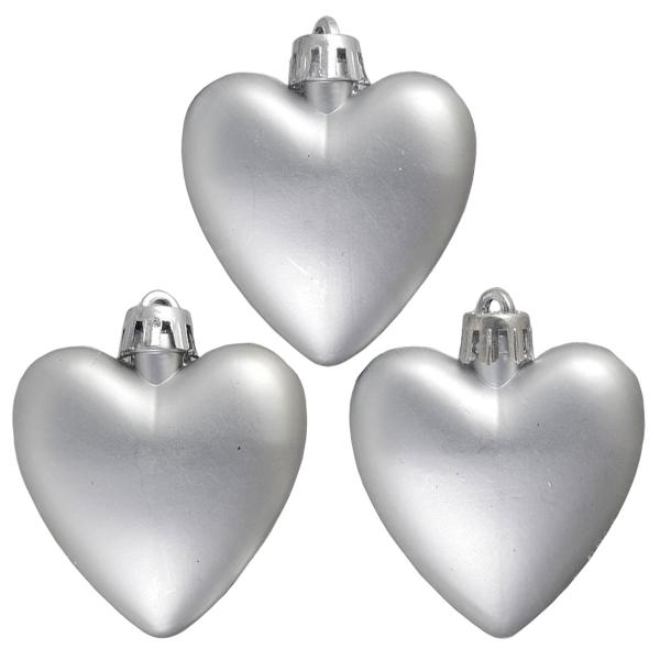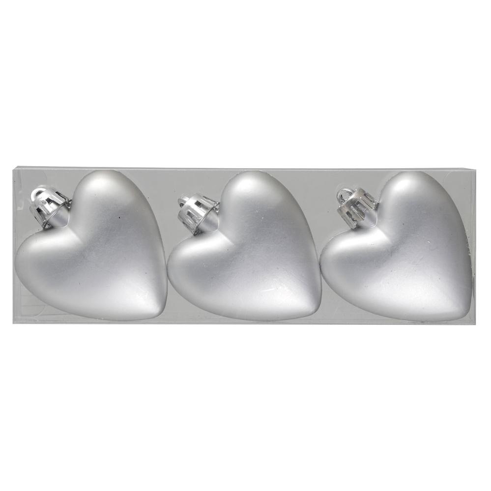Juletrepynt Sølv Hjerte 3-pakning inneholder tre hjerteformede juletrepynt i sølvfarget plast.