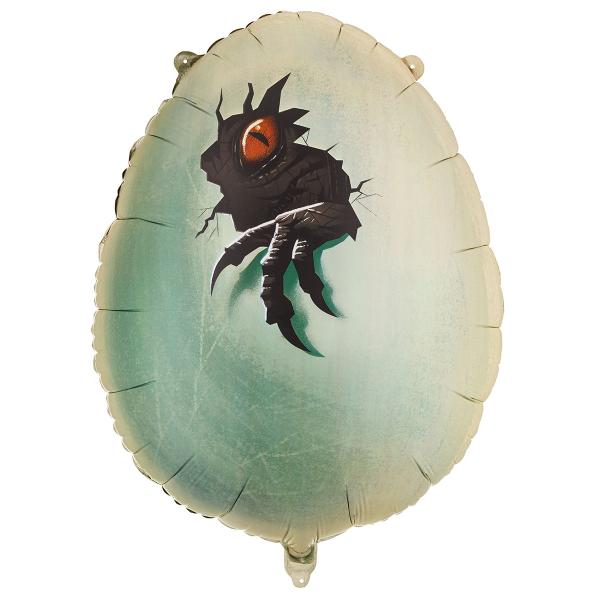 Jurassic World Dinosauregg Folieballong 48 x 64 cm består av en lysegrønn folieballong i form av et dinosauriegg, dekorert med et motiv av en dinosaur med et oransjerødt øye og skarpe klør som ser ut til å bryte seg ut av ”egget”.