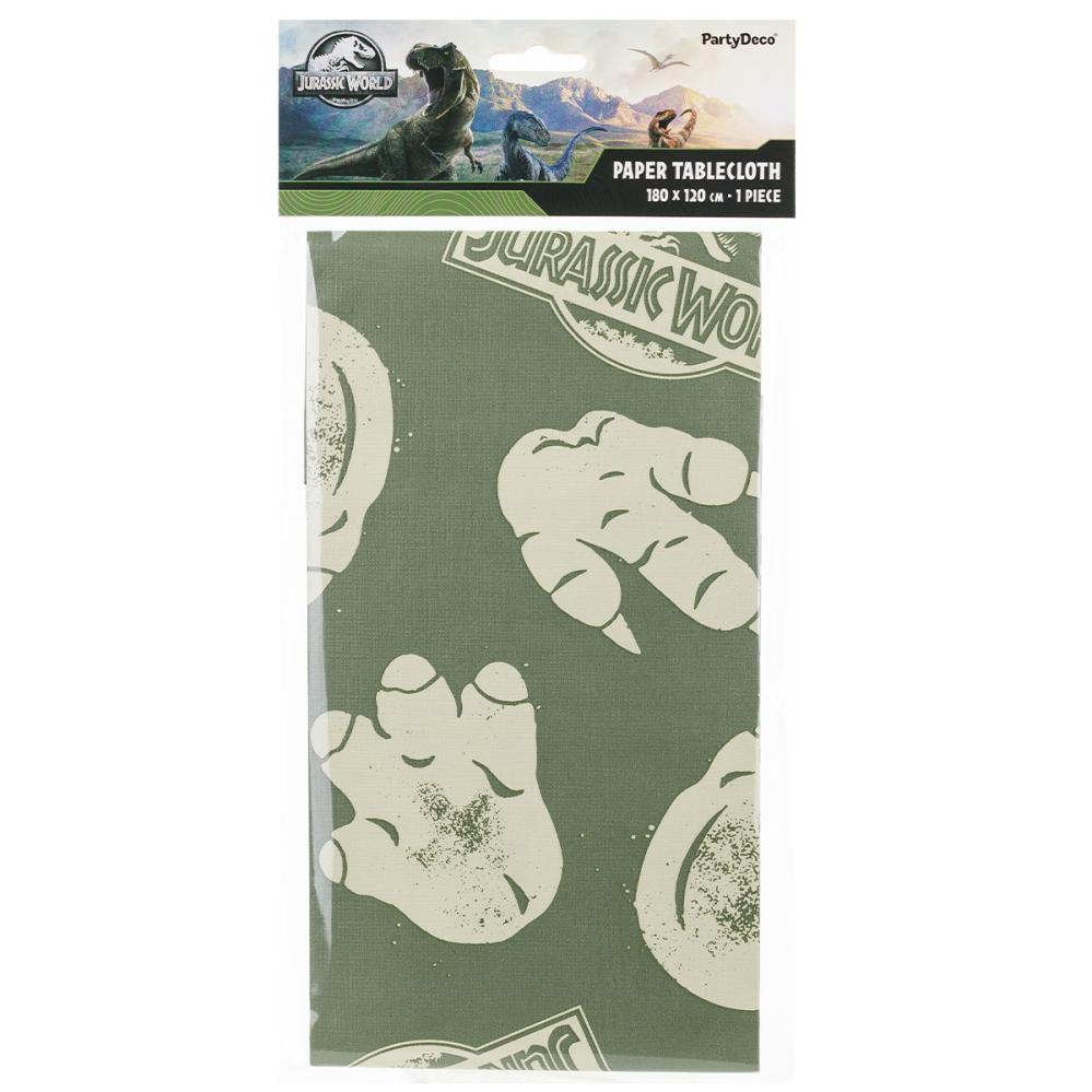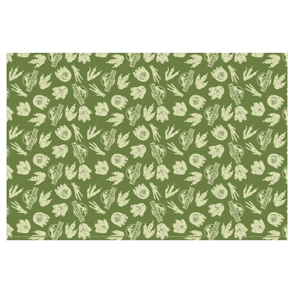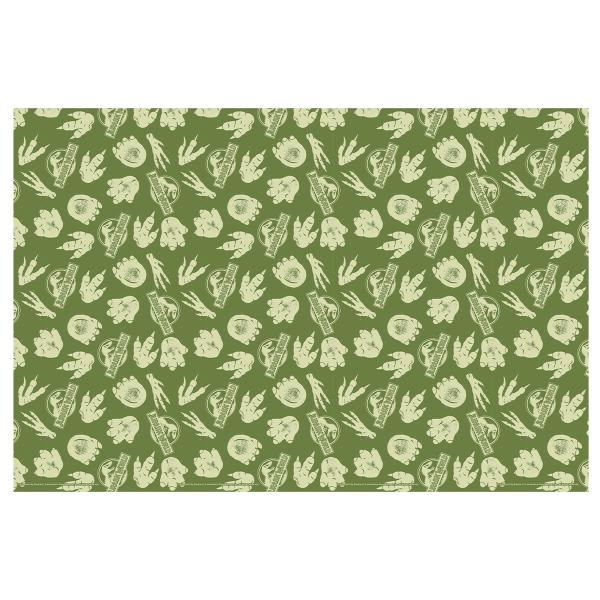 Jurassic World Papirduk 180 x 120 cm består av en grønn papirduk med jungelinspirert design, dekorert med logoen til Jurassic World og dinosaurspor.