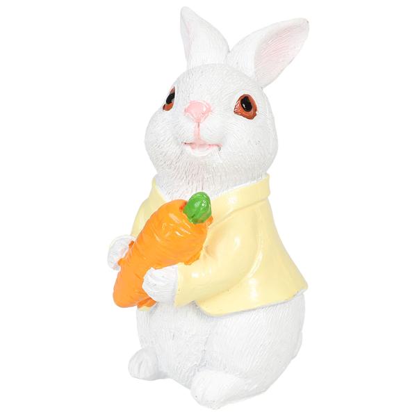 Kanin med Gulrot 5x10 cm er en påskedekorasjon i form av en hvit kanin som holder en oransje gulrot og har på seg en gul jakke.