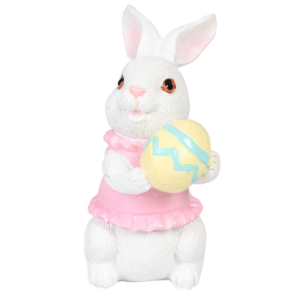 Kanin med Påskeegg 5x10 cm er en påskedekorasjon i form av en hvit kanin som holder et påskeegg og har på seg en rosa kjole.