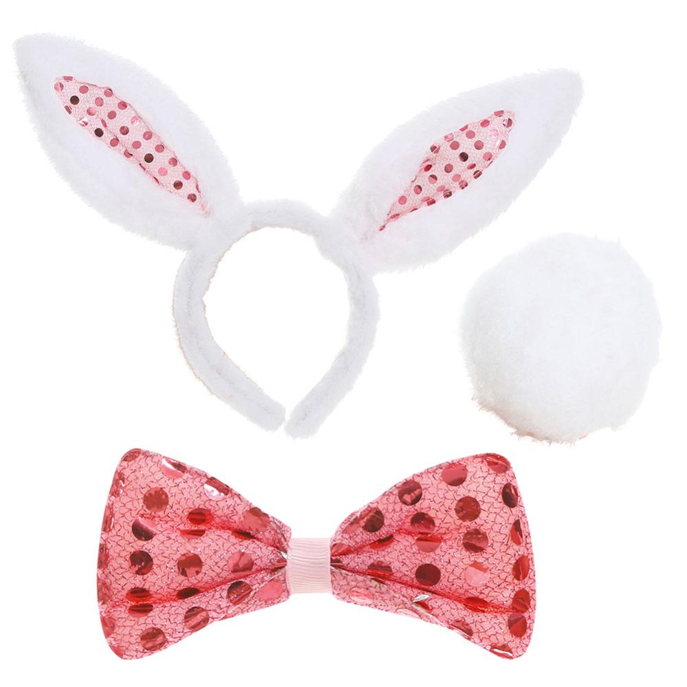 Kaninsett Hvit/Rosa 3-pakning omfatter et kaninsett med en hvit kaninhale, en rosa sløyfe med skimrende paljetter og et hvitt elastikkbånd, samt et hvitt diadem i fløyelslignende polyester med kaninører og rosa innside, dekorert med skimrende paljetter.