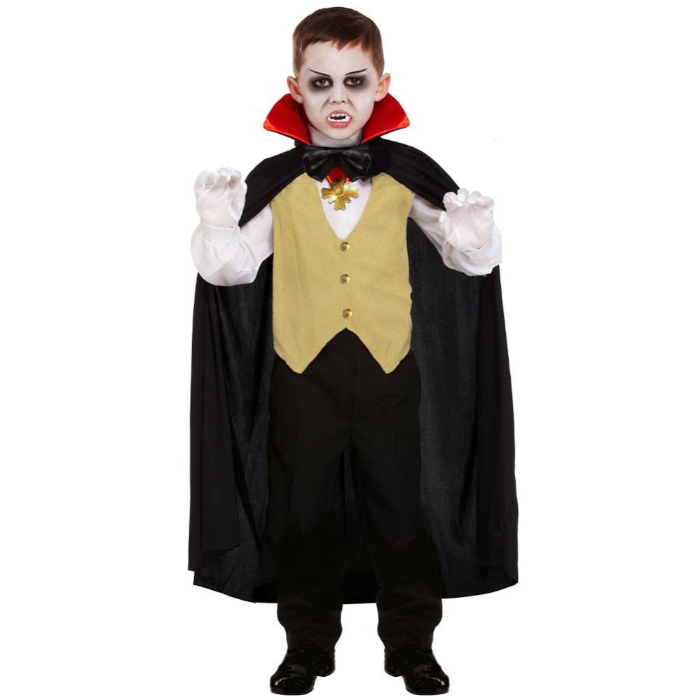 Forvandle ungen din til nattens hersker med denne Halloween-vampyrdrakten for barn. Dette er et stilig vampyrkostyme og halloweenkostyme med kappe, vest og detaljer som tar Halloweenklær for barn til et nytt nivå.