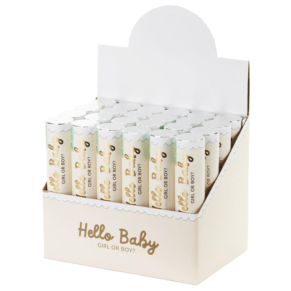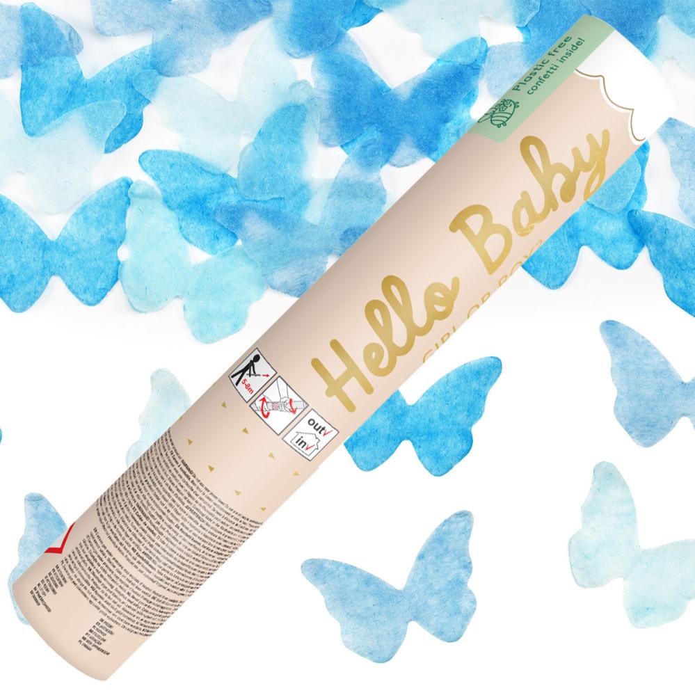 Med denne konfettikanonen spres konfetti som blå sommerfugler, noe som gjør babyshoweren din eller din gender reveal til minneverdige stunder. Designen med sommerfuglkonfetti gir hver feiring en leken og fargerik følelse.