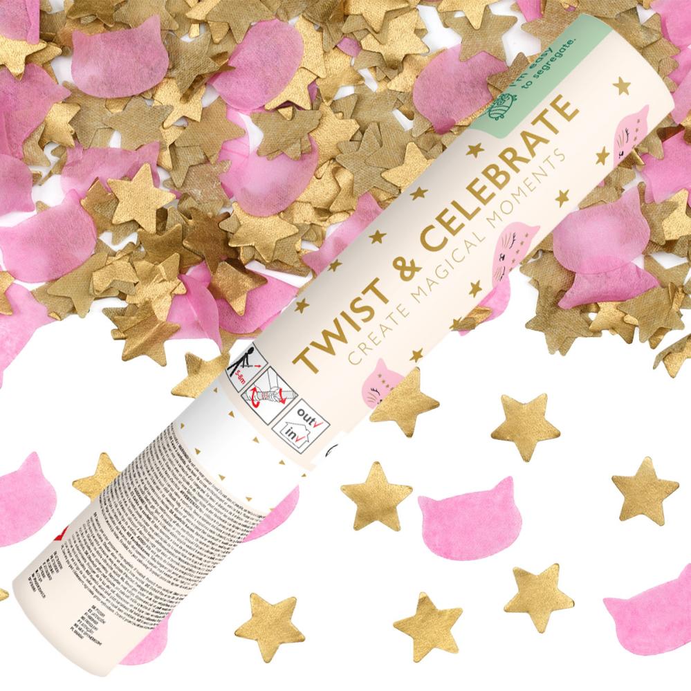 Konfettikanon Katter & Stjerner 20 cm omfatter en konfettikanon som skyter ut papirkonfetti i form av gullfargede stjerner og rosa katteansikter når den nedre delen av kanonen vris.