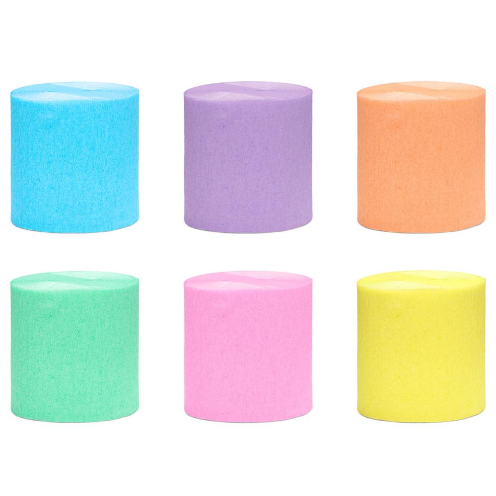Kreppapir Pastell Fargemix 6-pakning inneholder seks ruller med kreppapir i pastellfargene blå, lilla, oransje, grønn, rosa og gul.