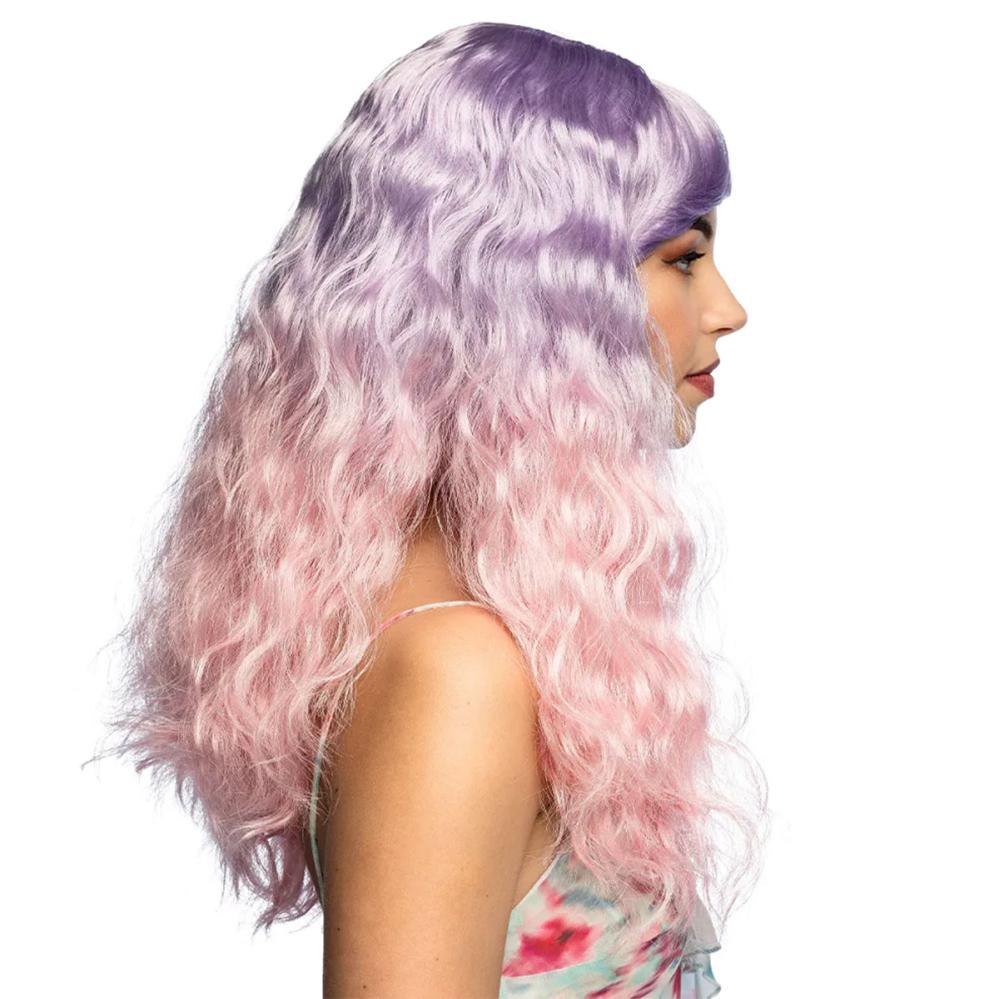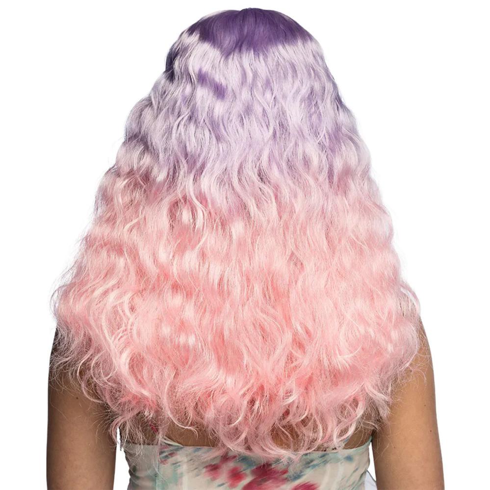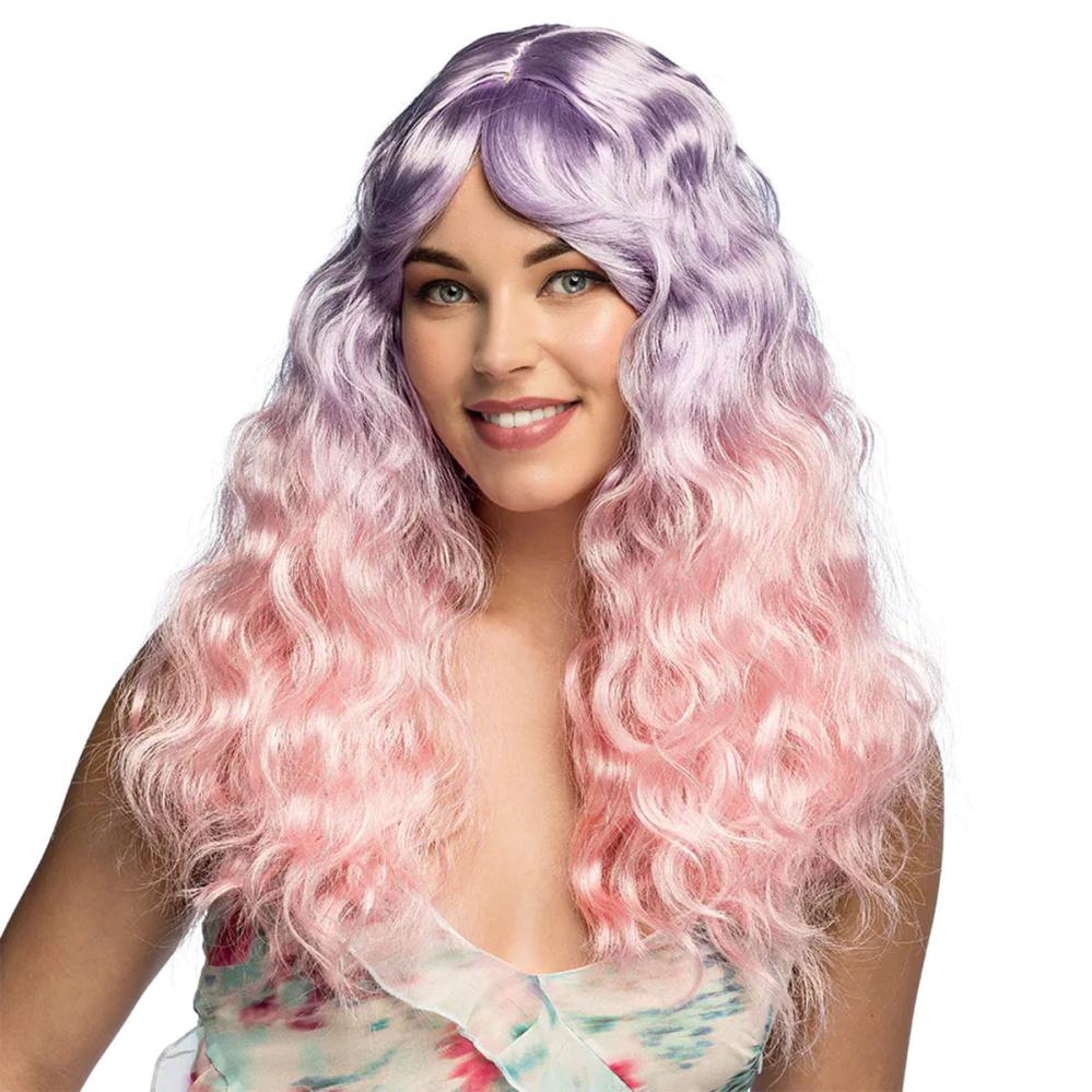 Krøllete Parykk Rosa/Lilla er en lang parykk med krøllete hår i rosa og lilla.