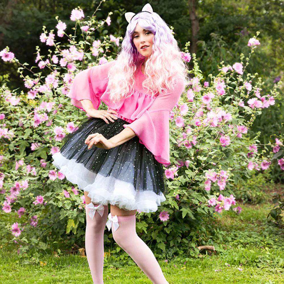 Til en maskerade skaper en parykk et lekent uttrykk der rosa samspiller med lilla i et krøllete og glansfullt hår, mens modellen oppleves som behagelig lang uten å filtre seg. Bruk et hårnett for bedre passform og gre varsomt før kvelden.