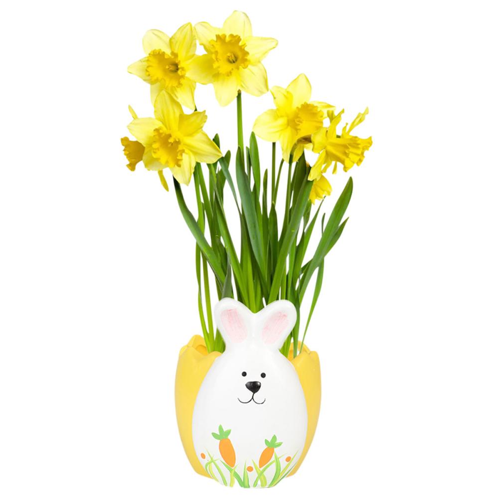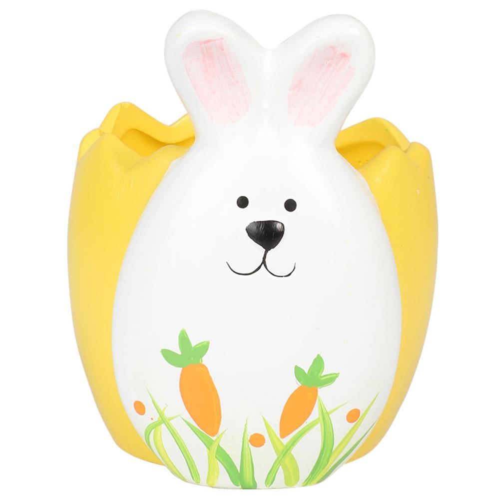Krukke Påskehare 9x7 cm omfatter en gul krukke som forestiller et egg og som i tillegg er dekorert med en hvit påskehare.