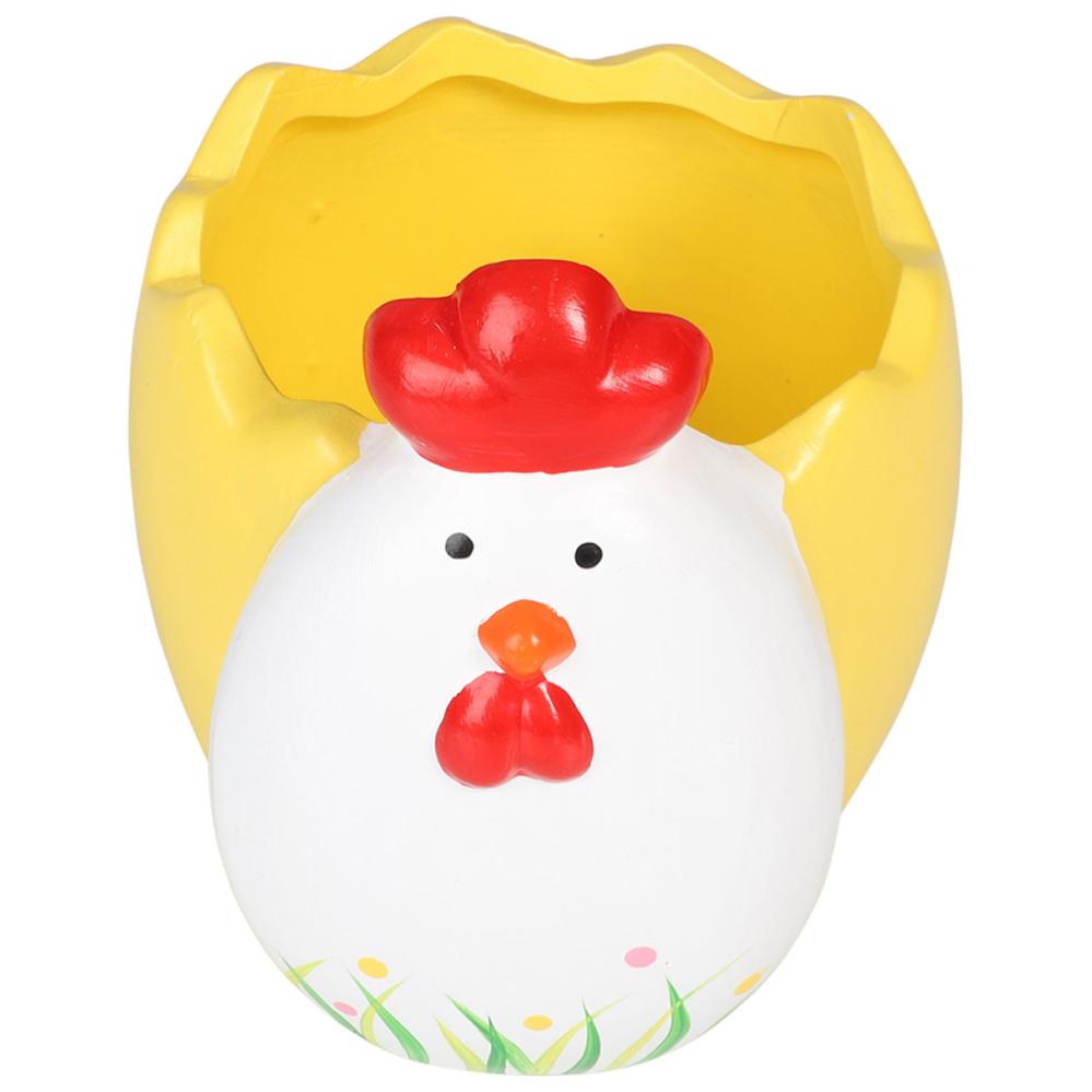 Krukke Påskekylling 9x7 cm er en gul krukke som forestiller et egg og som i tillegg er dekorert med en hvit påskekylling.