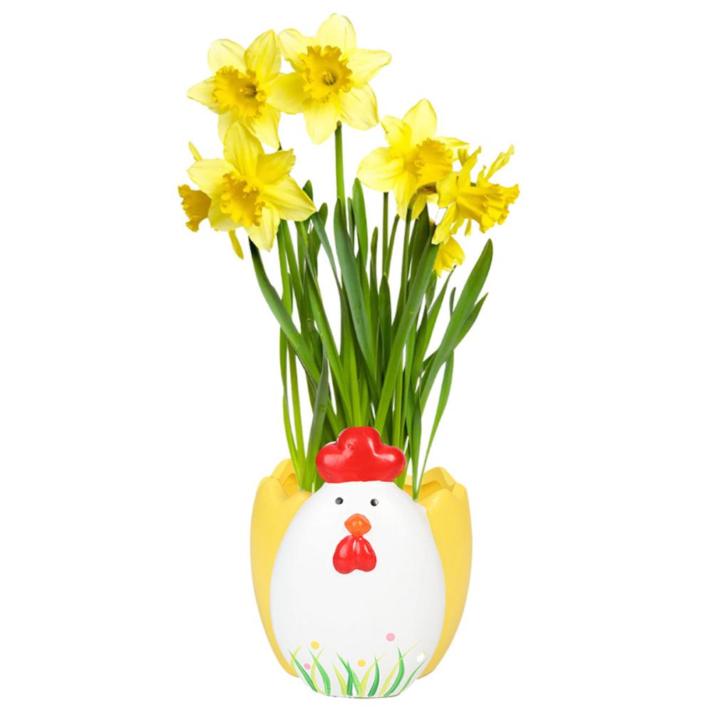 Denna påskekrukke i form av et egg med en søt hvit kylling passer perfekt som en blomsterpotte til påske. En morsom og fargerik krukke med påskemotiv som løfter både planter og påskestemningen.