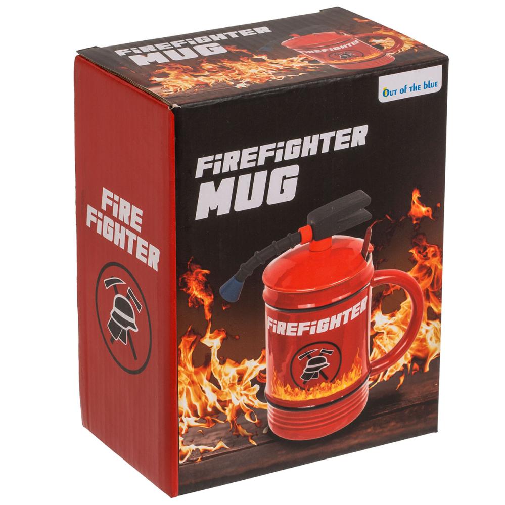 Krus Brannslukningsapparat 45 cl består av et stort rødt keramikkrus formet som et brannslukningsapparat, dekorert med ildmotiv, en svart logo og teksten ”FIREFIGHTER” i hvitt. Kruset leveres med et praktisk lokk som bidrar til å holde drikken varm, samt en avlang skje som enkelt kan plasseres i det lille hullet i lokket.