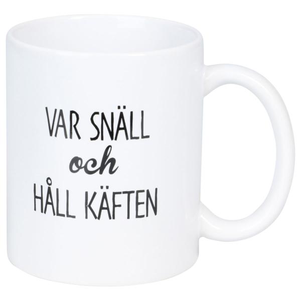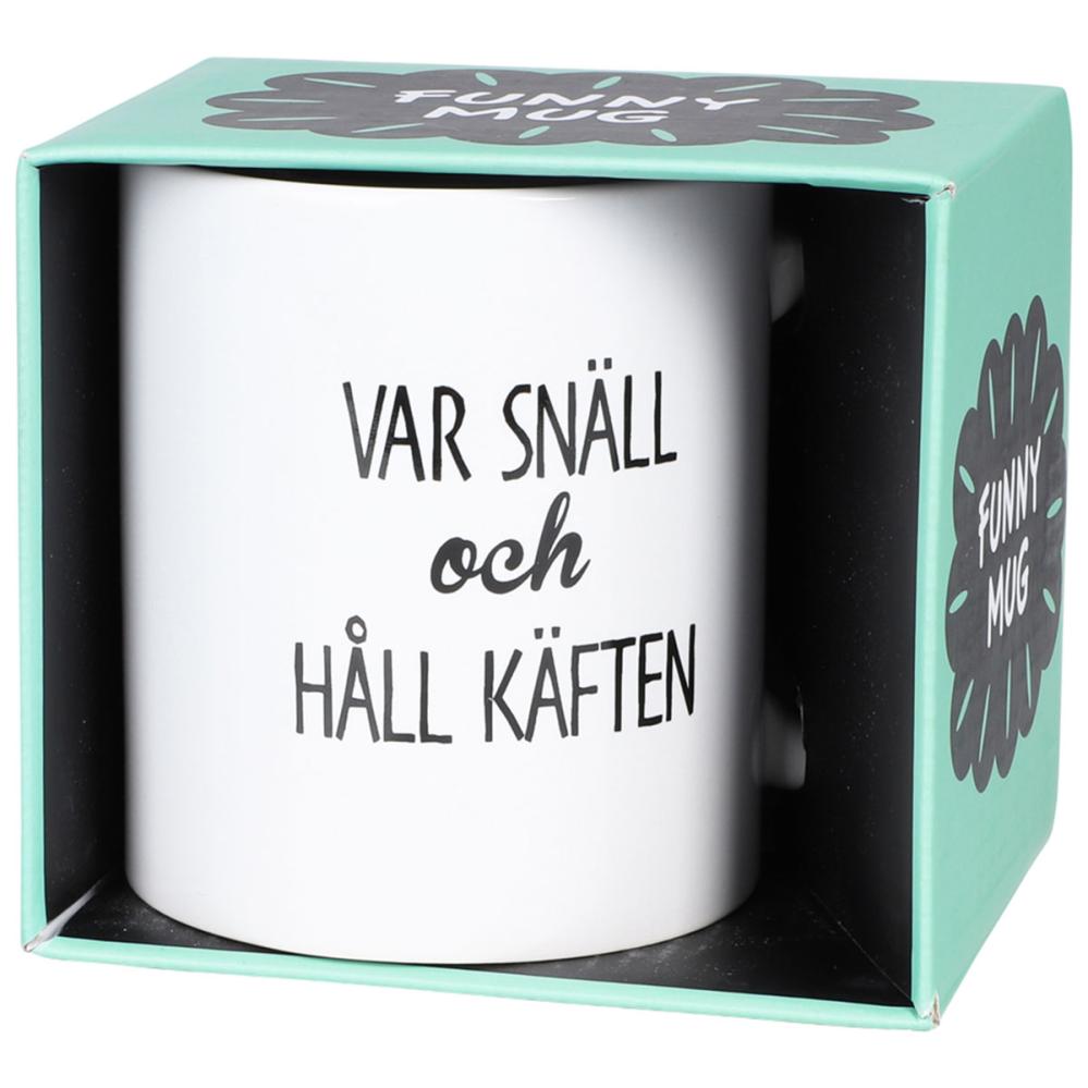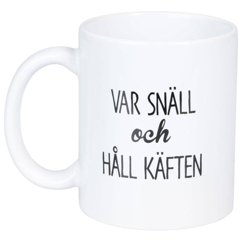 Krus Var Snäll och Håll Käften 300 ml er et hvitt porselenskrus med svart tekst trykket på begge sider som sier ”VAR SNÄLL och HÅLL KÄFTEN”.