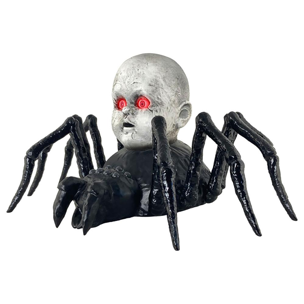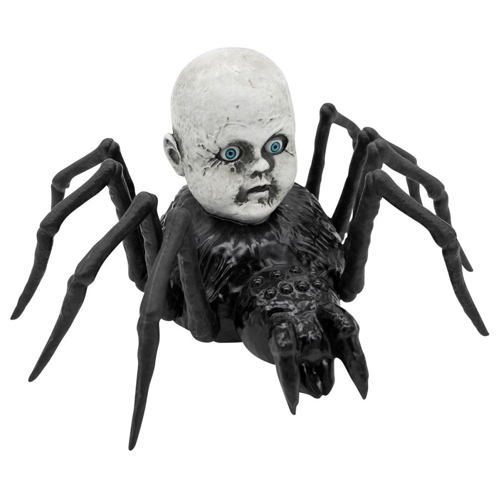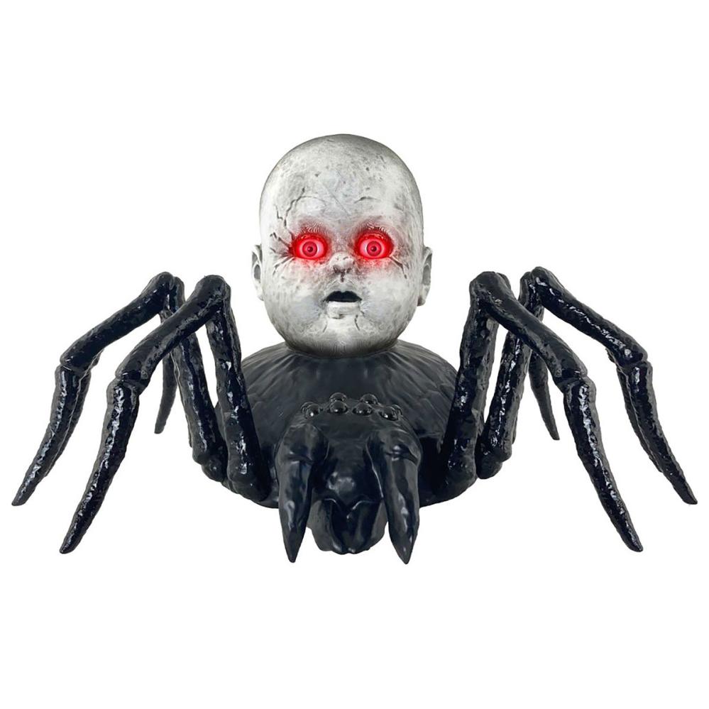 Krypende Edderkopp med Dukkehode Animert Rekvisitt omfatter en stor svart edderkopp med et skummelt grått dukkehode på ryggen. Når den aktiveres begynner edderkoppen å krype rundt mens dukkens øyne lyser rødt. Slå bare på strømbryteren og klapp i hendene, da våkner denne marerittaktige skapningen til liv. Den beveger seg over gulvet og gir fra seg uhyggelige edderkopplyder som garantert skaper en skremmende stemning.