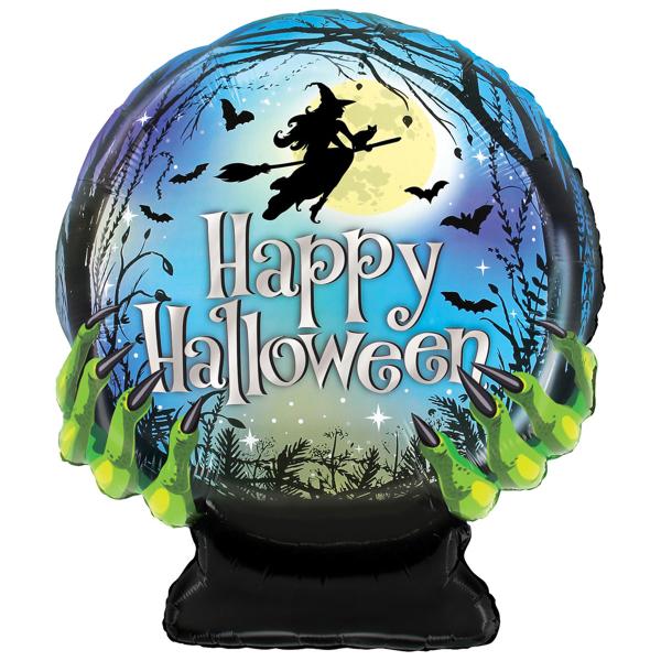 Krystallkule Folieballong inkluderer en folieballong formet som grønne heksehender som holder en krystallkule som er dekorert med teksten ”Happy Halloween”, en måne samt svarte dekorasjoner som en heks, flaggermus og planter på en blå og lilla bakgrunn.