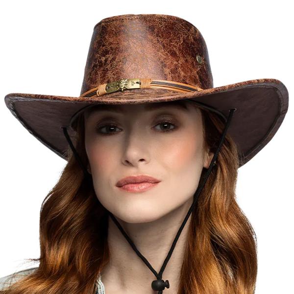 Lær Cowboyhatt Brun omfatter en brun cowboyhatt med et bånd rundt i brunt og svart med en messingfarget dødningehode. Hatten holdes på plass med en justerbar svart snor under haken.