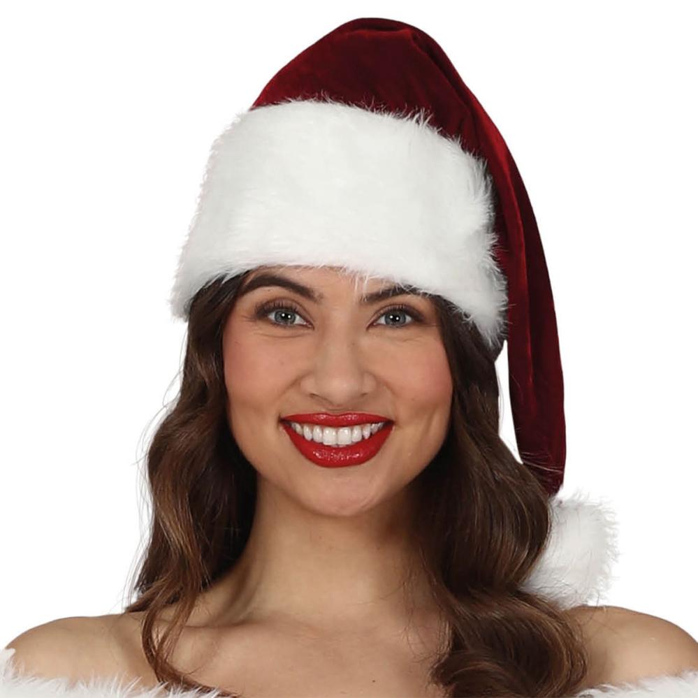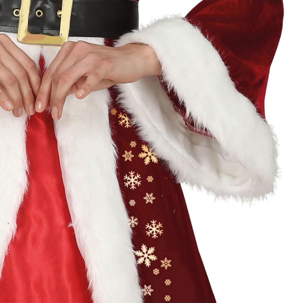Lang Julekjole med Tilbehør omfatter et julekostyme med en nisselue, et svart midjebelte med gullspenne og en lang rød julekjole med hvit fuskepelskant og gullfargede snøfnugg på sidene.