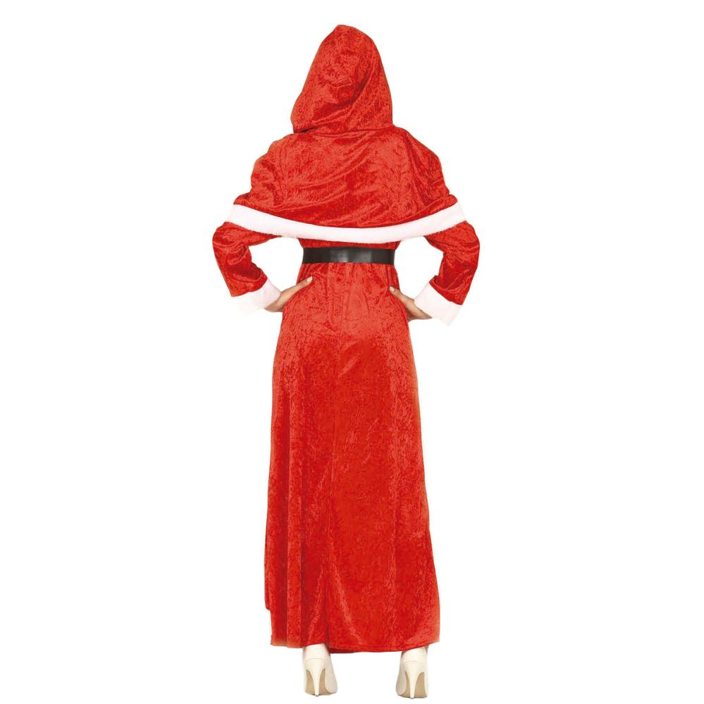 Lang Nissemor Julekostyme omfatter et langt rødt nissemorkostyme i velur med hvite plysjkanter, en matchende kappe og et svart belte med gullfarget spenne.