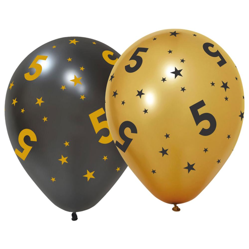 Latexballonger med Stjerner & Tallet 5 6-pakning inneholder seks latexballonger hvorav tre har stjerner og tallet ”5” i svart på gullfarget bakgrunn og de andre tre har samme motiv i motsatte farger.