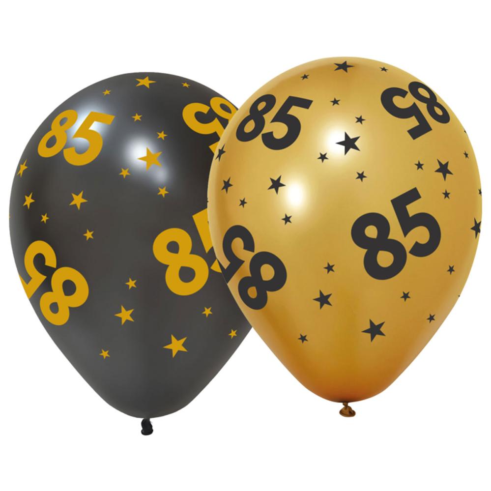 Latexballonger med Stjerner & Tallet 85 6-pakning inneholder seks lateksballonger, hvorav tre har stjerner og tallet ”85” i svart på gullfarget bakgrunn og de andre tre har samme motiv i omvendte farger.