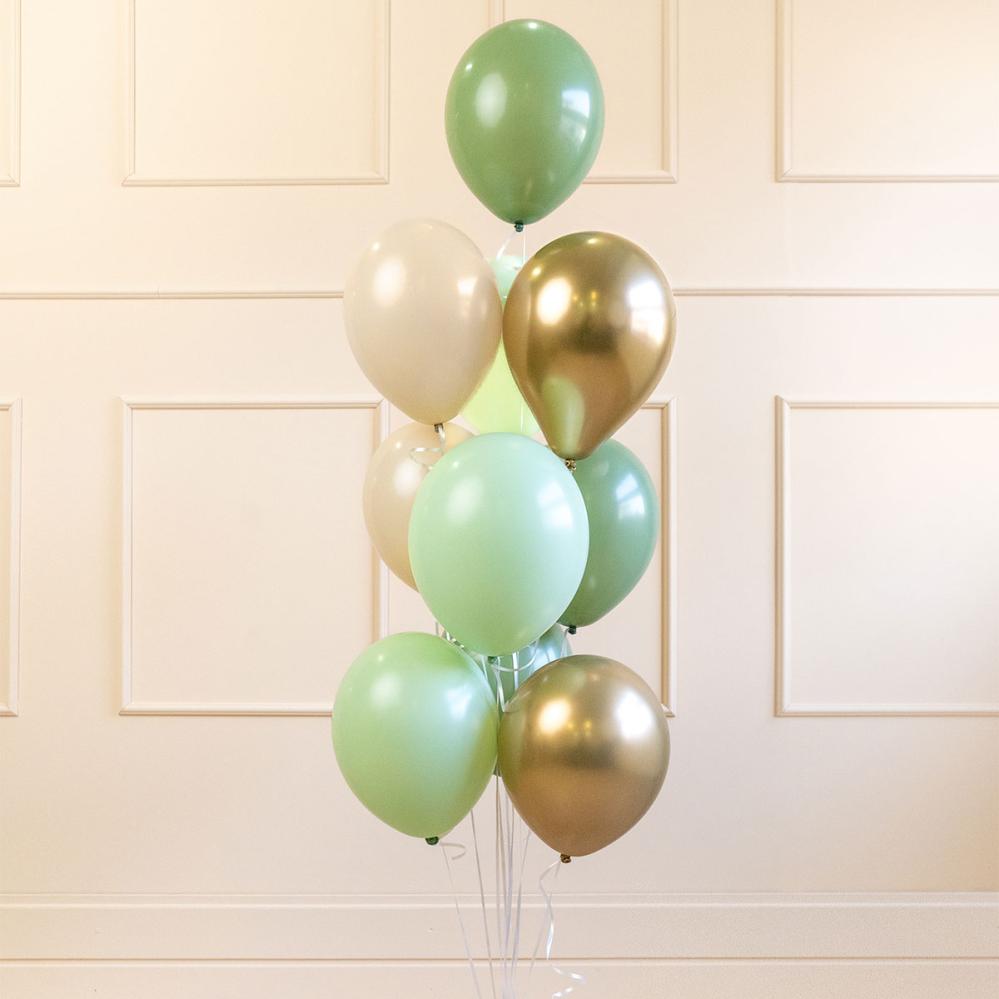Med disse ballongene skaper man en elegant dekorasjon der grønn farge kombineres med gull og beige, noe som passer utmerket for både bryllup og en stilfull fest. Fargene gir festen en myk og festlig følelse.