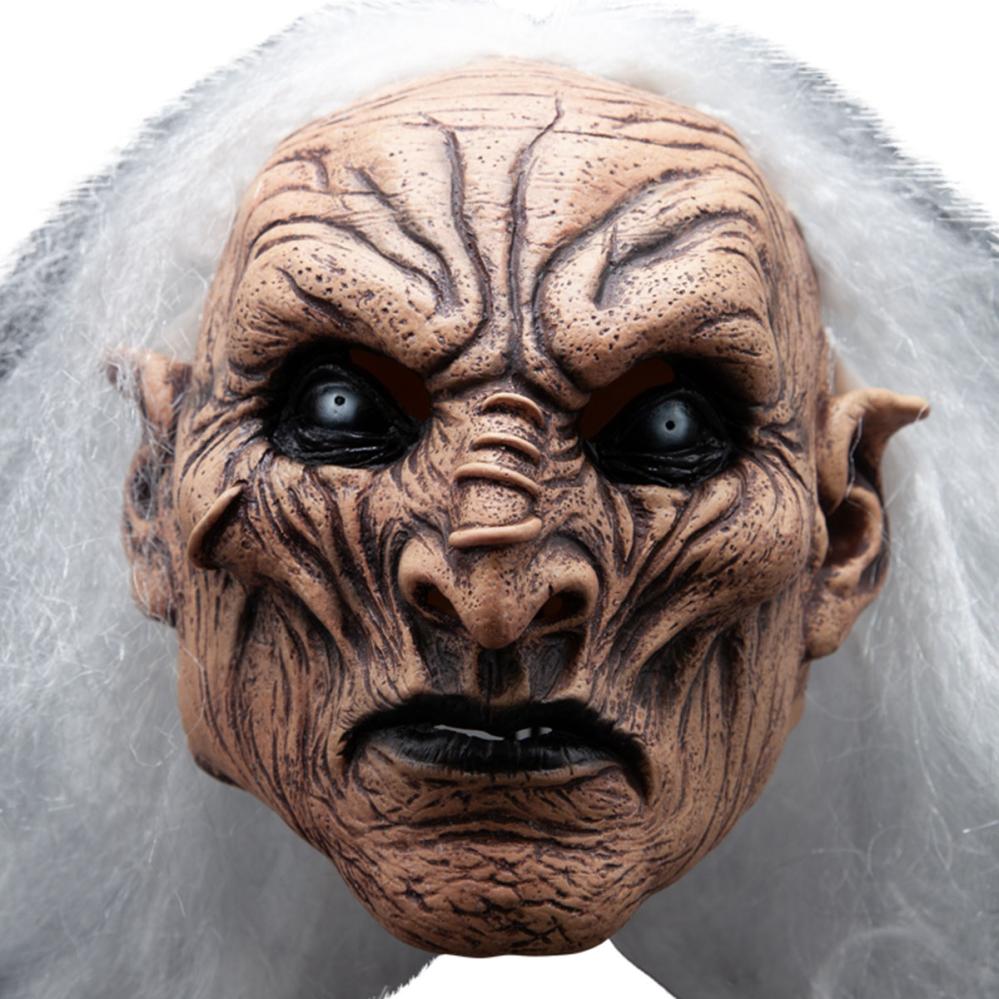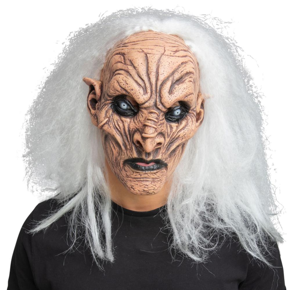 Latexmaske med Hår Demon omfatter en beige lateksmaske med demonmotiv som har svarte detaljer og hvitt hår og holdes på plass med et svart elastisk bånd.