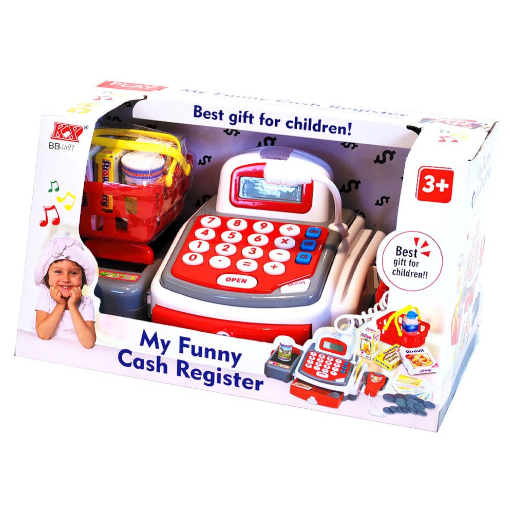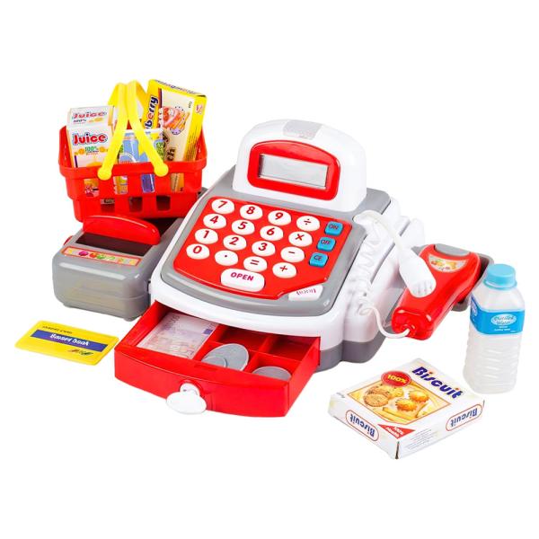 Lekekasse med Lyd Lys og Tilbehør omfatter en rød og hvit lekekasse med fungerende mikrofon, skanner med lyd og lys samt et rullebånd. Medfølger også lekepenger, et betalingskort, liten kassenøkkel, en liten kundekurv og 5 stykker små lekevarer. Kassen drives av 2 stk AA-batterier og er ca 14 cm høy, 25 cm bred samt 17 cm dyp. Lekene er laget av plast og papp, og passer for barn fra 3+ år.