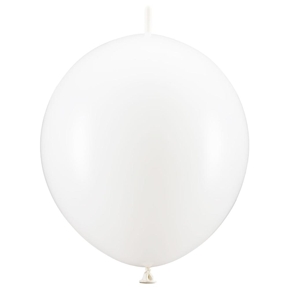 Lenkende Ballonger Hvit Pastell 20-pakning består av tjue lenkende latexballonger i en pastellnyanse av hvitt, som bindes sammen for å skape en dekorasjon.