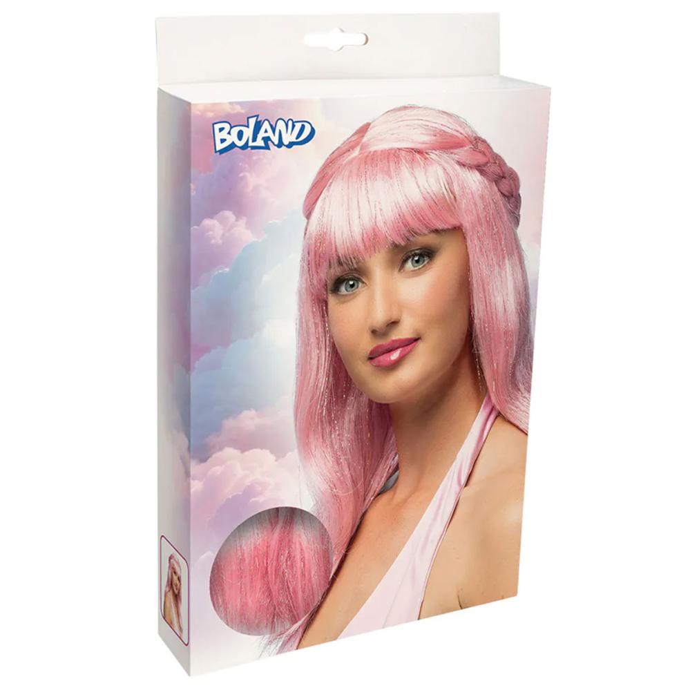 Lyserosa Parykk med Fletter er en lyserosa, lang og rett parykk med en kort rett lugg. Parykken har også to fletter som møtes på baksiden samt skimrende tråder som er vevd inn i håret for å gi en ekstra glitrende og festlig effekt.