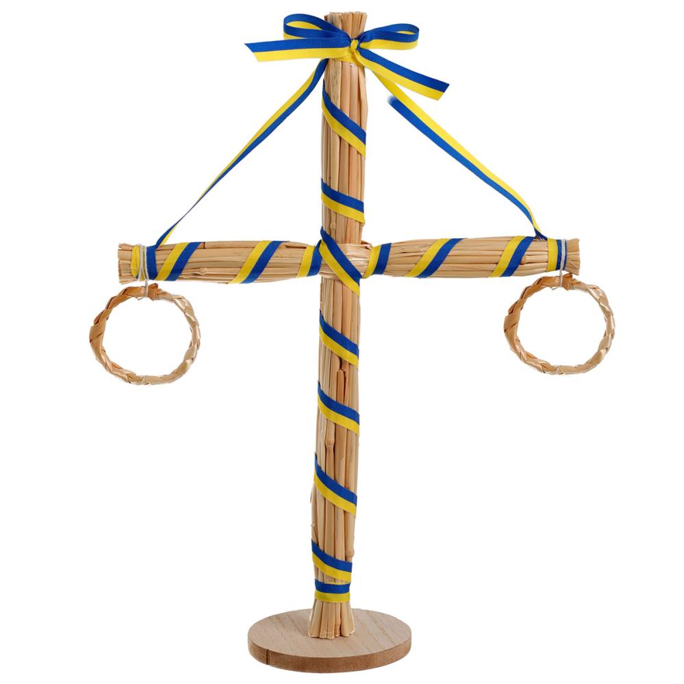 Majstang i Halm 32 cm omfatter en majstang i miniatyr av halm med rund trefot, dekorert med tekstilbånd i blått og gult og to hengende kranser.