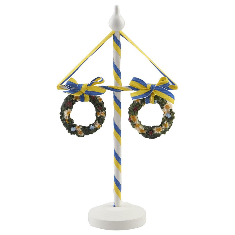 Majstang Tre 25 cm omfatter en hvit majstang i miniatyr av tre med rund fot, dekorert med tekstilbånd i blått og gult og to hengende blomsterkranser.