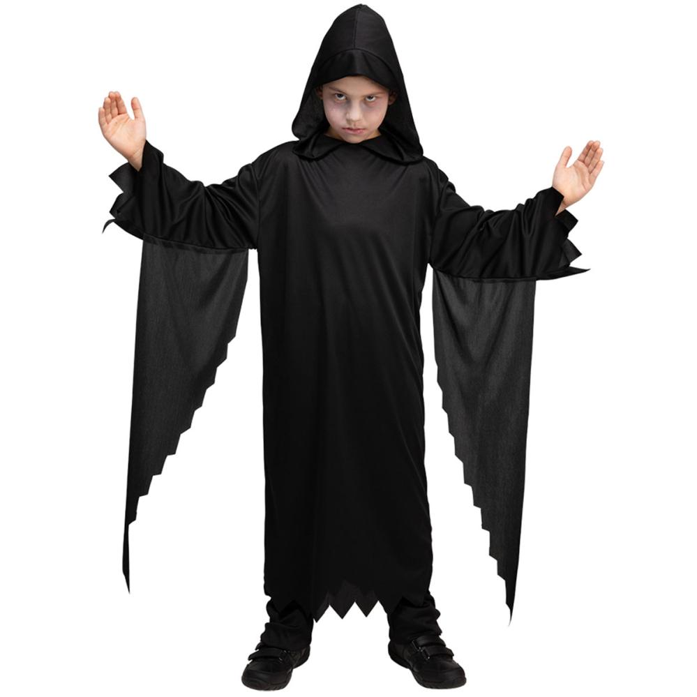 Mannen med Ljåen Drakt Barn består av en lang, svart drakt med vide ermer, taggete kanter og en matchende svart hette.