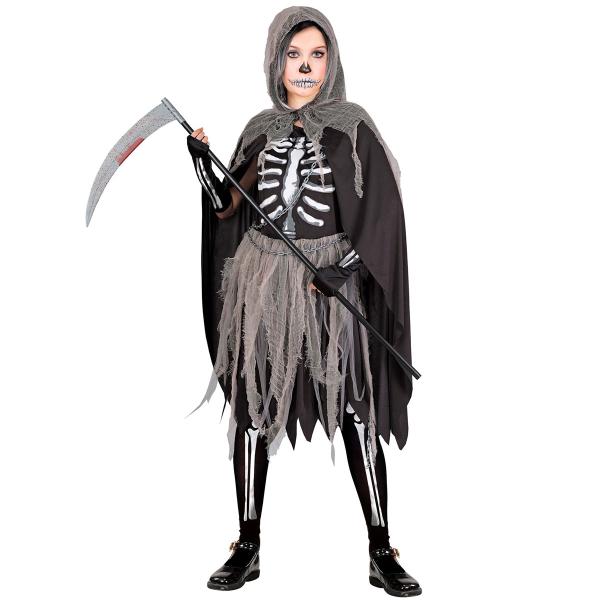 Mannen med Ljåen Kostyme med Skjelett Barn er et kostyme i svart, hvitt og grått med motiv av mannen med ljåen og skjelett. Drakten består av en kjole, et par leggings, lange fingerløse hansker, en kappe med hette og en sølvfarget kjede rundt midjen.
