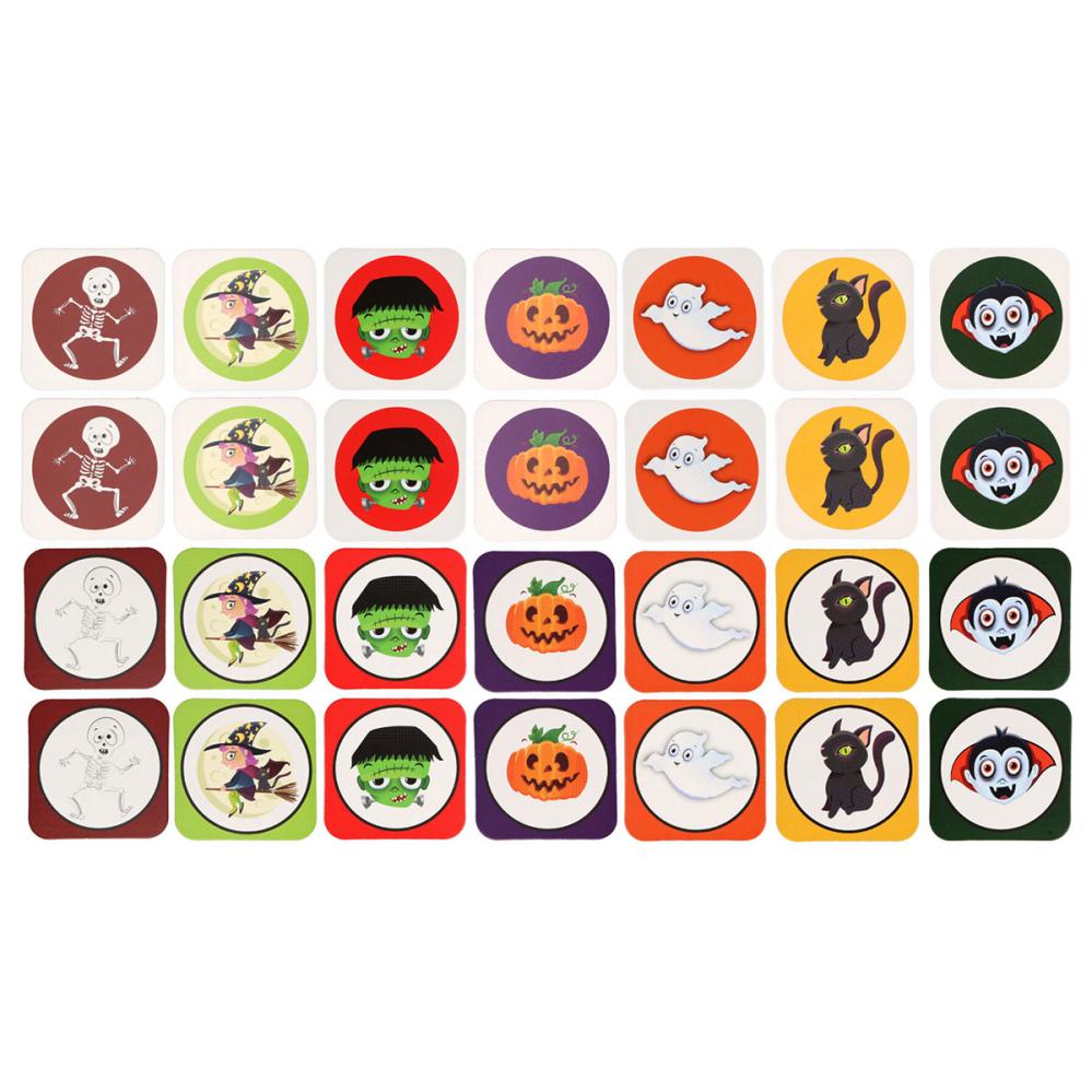 Memoryspill Halloween 28 Kort omfatter et memoryspill med 28 kort som har morsomme halloweenmotiver. Spillet går ut på at spillerne bytter på å snu to kort om gangen og forsøker å finne par. Spilleren som finner flest par vinner.