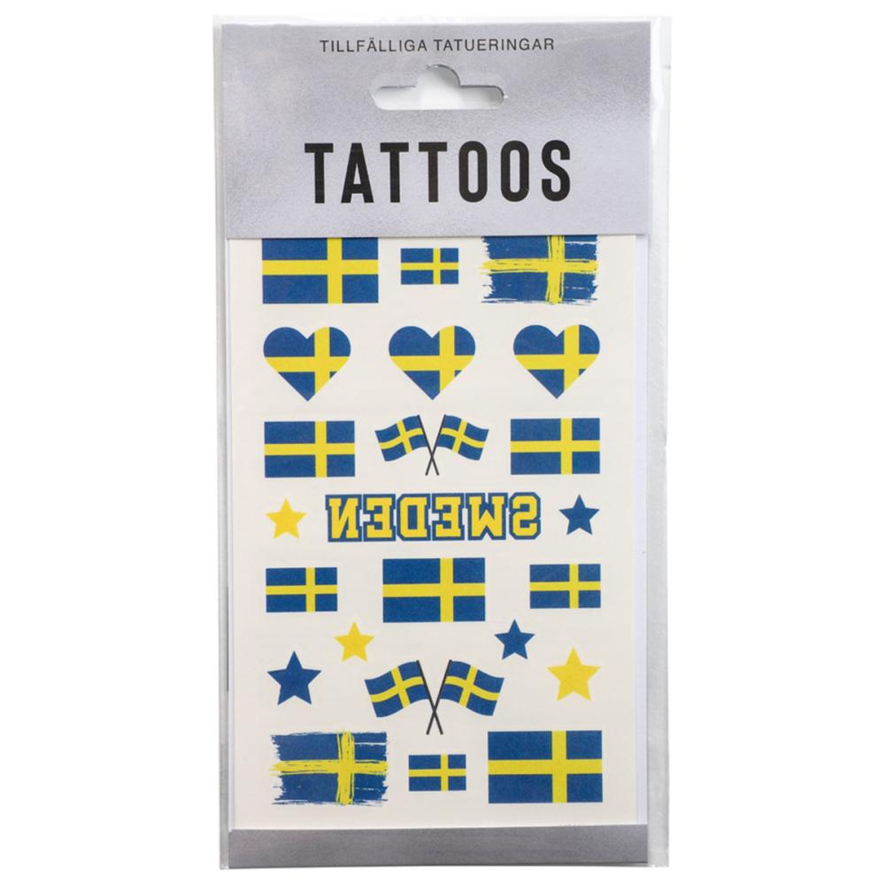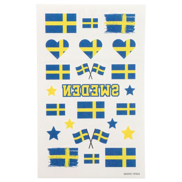 Midlertidige Tatoveringer Sverige 23-pakning består av et ark med 23 stk. midlertidige tatoveringer i form av Sverigeflagg og andre blågule motiv.