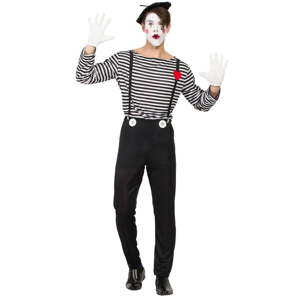 Mimekunstner Kostyme omfatter et svart kostyme med motiv av en mimekunstner samt en basker, en stripete skjorte i svart og hvitt, svarte bukseseler, et merke i form av et rødt hjerte, et par hvite hansker og et par svarte bukser.