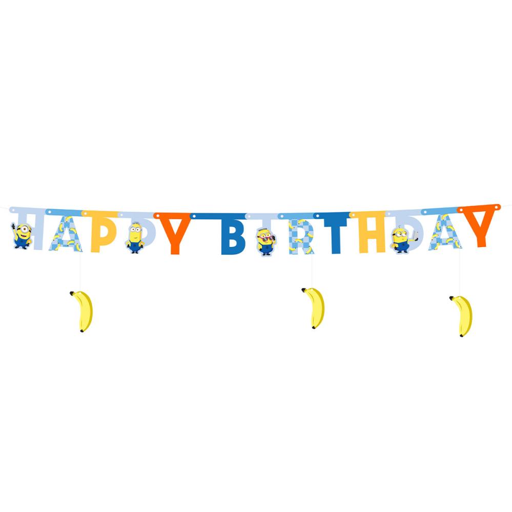 Minions Happy Birthday Girlander 153 x 50 cm omfatter en fargerik girlander som danner teksten ”Happy Birthday”, der enkelte bokstaver har et blått rutemønster med bananmotiv og andre er pyntet med ulike Minions. Girlanderen har også tre hengende dekorasjoner i form av bananer og leveres med snor samt hvite plastnagler for montering.