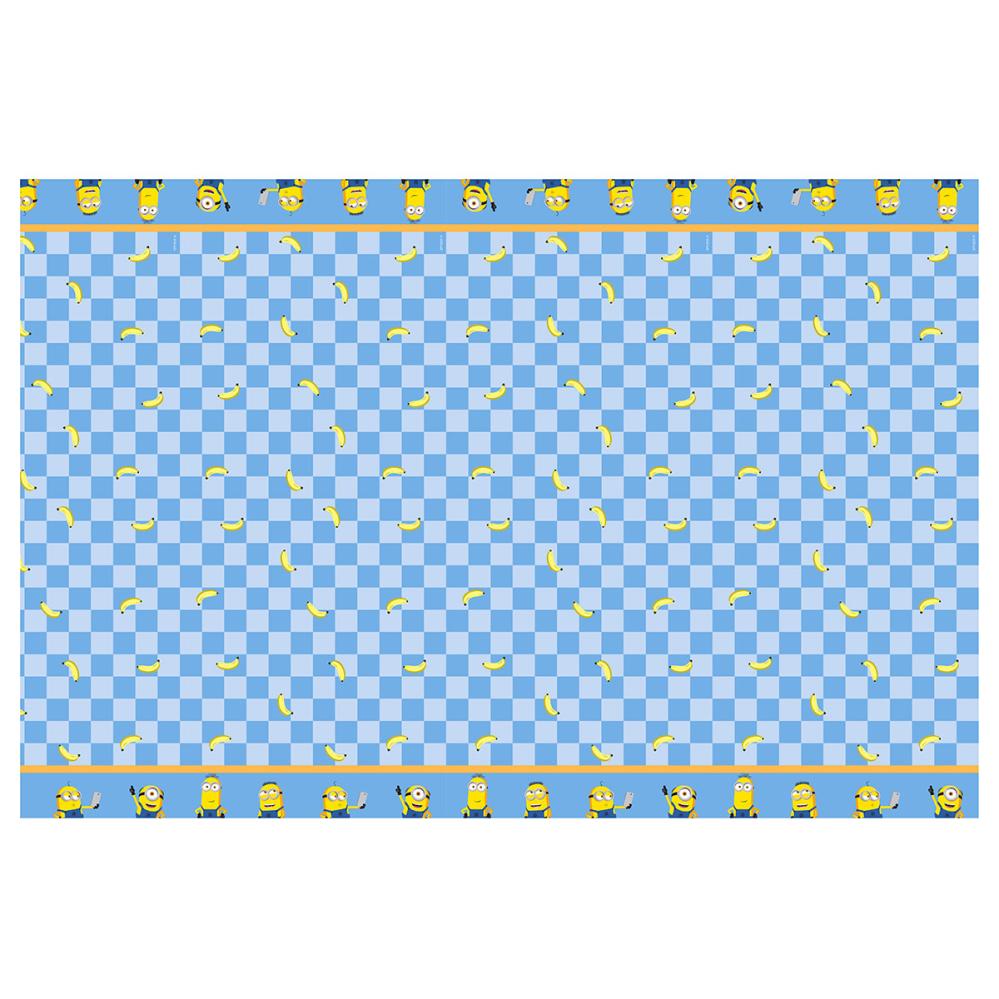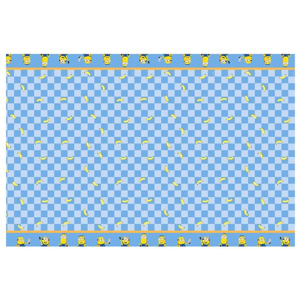Minions Papirduk 180 x 120 cm består av en blårutet papirduk med bananmotiv i rutemønsteret samt ulike Minions-figurer langs langsidene.