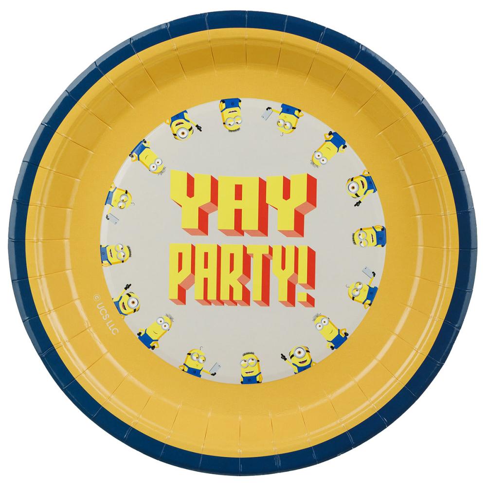 Minions Papptallerkener 23 cm 6-pakning består av seks runde engangstallerkener i blått og gult, med lett opphøyde kanter. Tallerkenene er dekorert med motiv av små Minions samt teksten ”YAY PARTY!”.