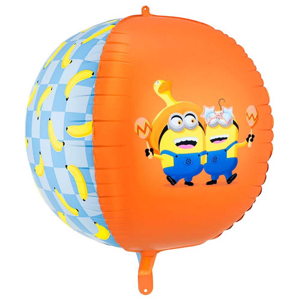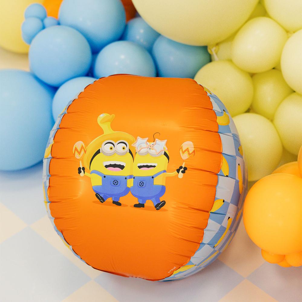 Minions Rund Folieballong 50 cm omfatter en rund folieballong i oransje med motiv av to festende Minions samt et blårutet parti med bananmotiv.