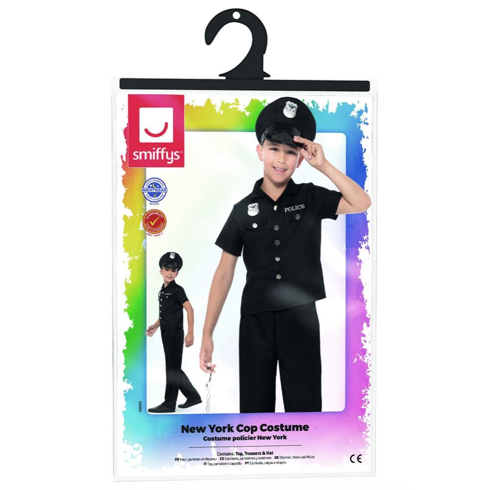 New York Politi Kostyme Barn omfatter en svart politidrakt som inneholder en skjorte, bukser og en hatt. Skjorten har sølvfargede knapper, et politiemblem samt teksten ”POLICE” og politihatten har et sølvfarget emblem foran.