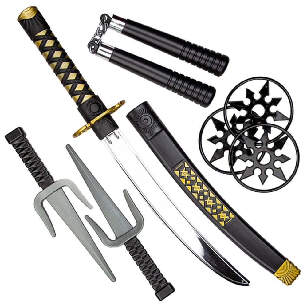 Kompletter ninja-kostymen din med dette kule ninjasettet i plast, perfekt som tilbehør til ninja-kostyme. Dette barnevennlige ninjasettet inneholder stilige ninjavåpen som kastestjerner, nunchucks, sai-kniver og et katanasverd.