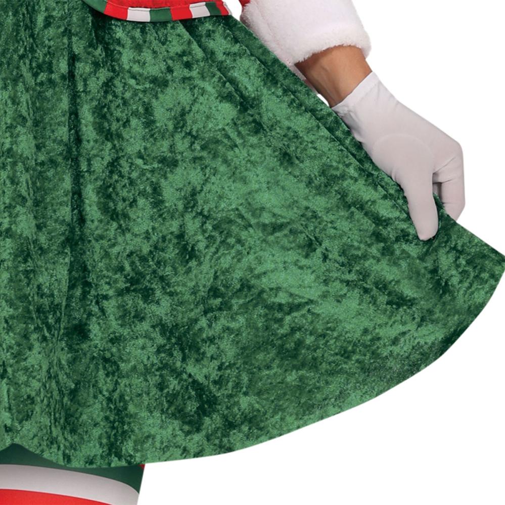 Nissejente Julekostyme Fløyel omfatter en nissejentedrakt i grønt, hvitt og rødt med en nisselue, et kort grønt skjørt, et par stripete leggings, et svart belte med gullspenne og en rød jakke med gullfargede knapper og hvite detaljer.