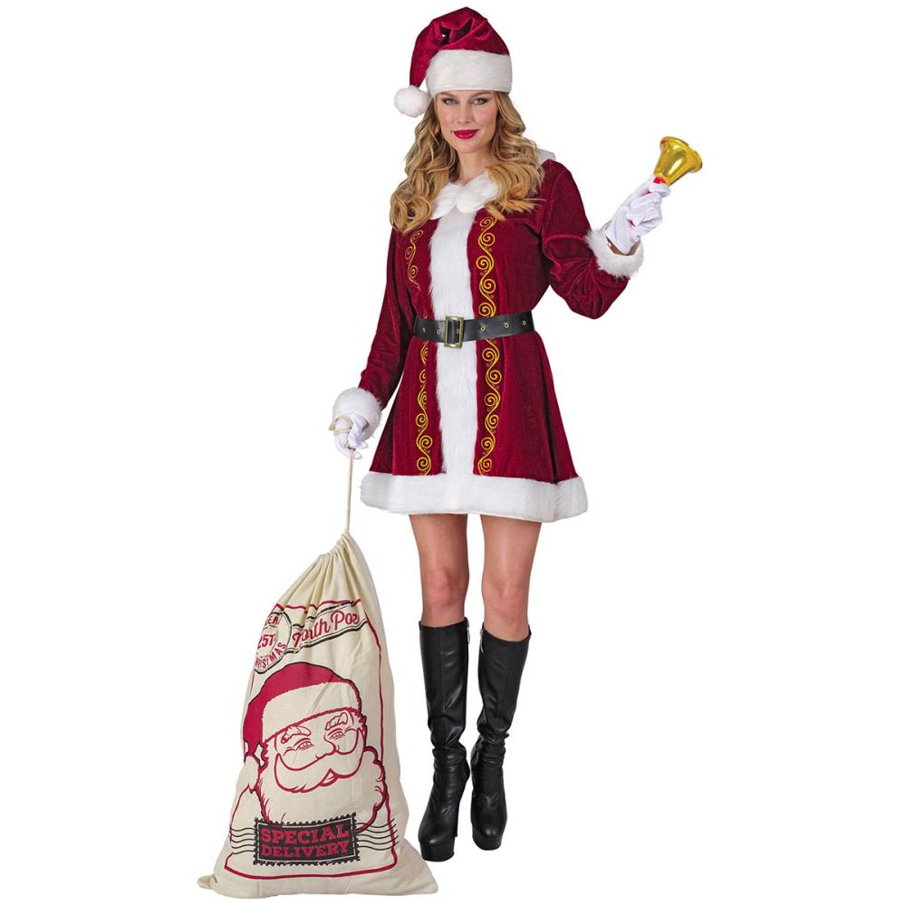 Nissemor Julekostyme omfatter en kort kjole i mørkerødt og hvitt med krage og gullfargede detaljer, et svart midjebelte med gullspenne samt en nisselue i mørkerødt og hvitt.
