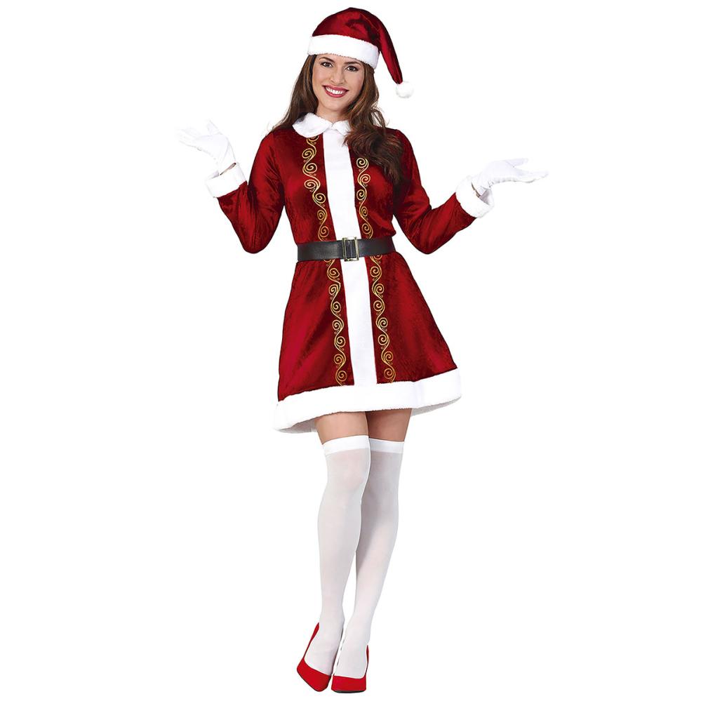 Nissemor Julekostyme Mørkerød er et julekostyme i mørkerødt og hvitt. Drakten inneholder en kort kjole med gullfargede detaljer, et svart midjebelte med gullspenne og en nisselue.