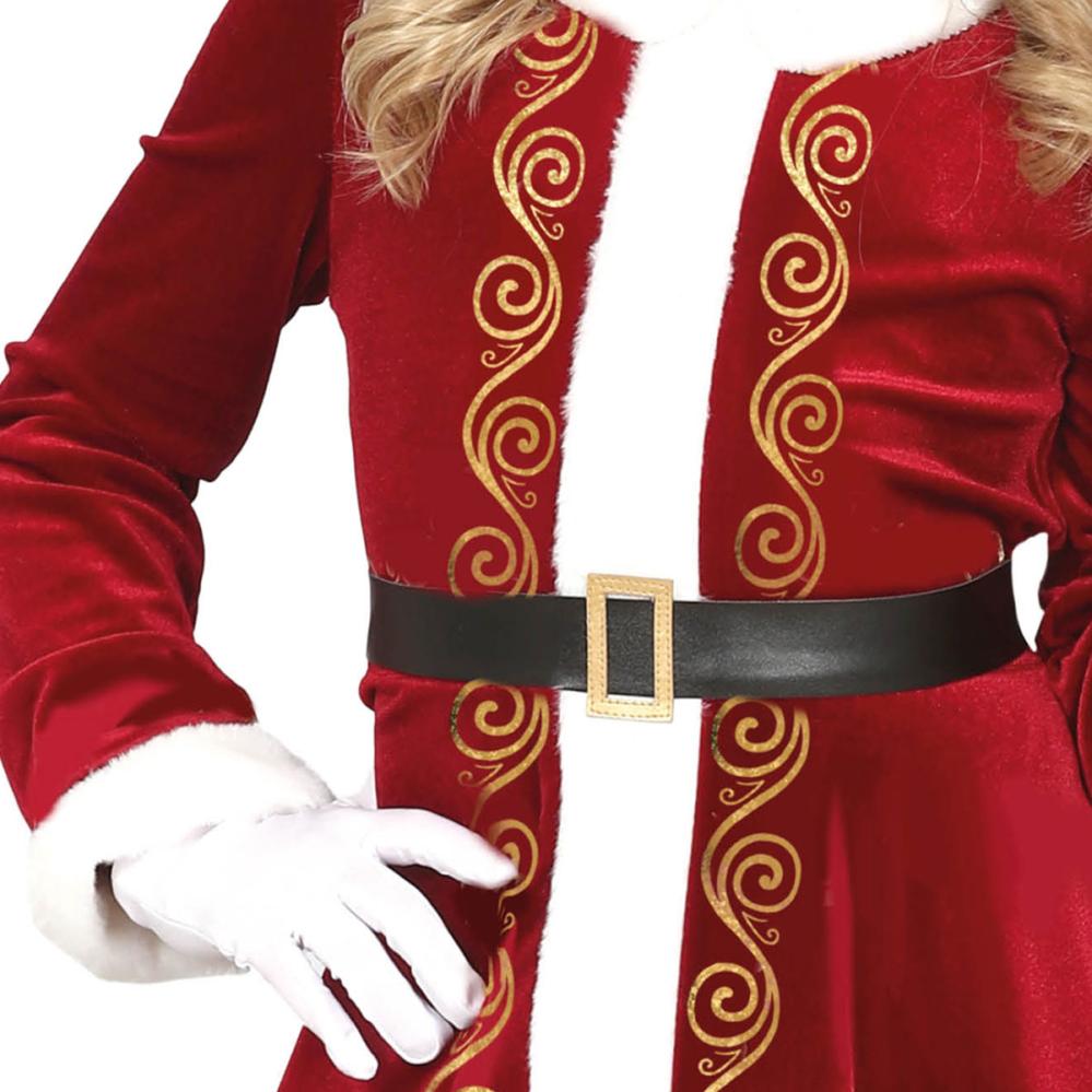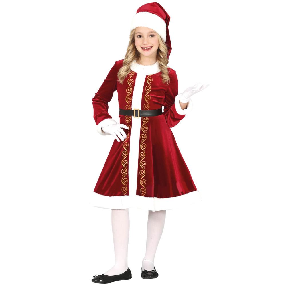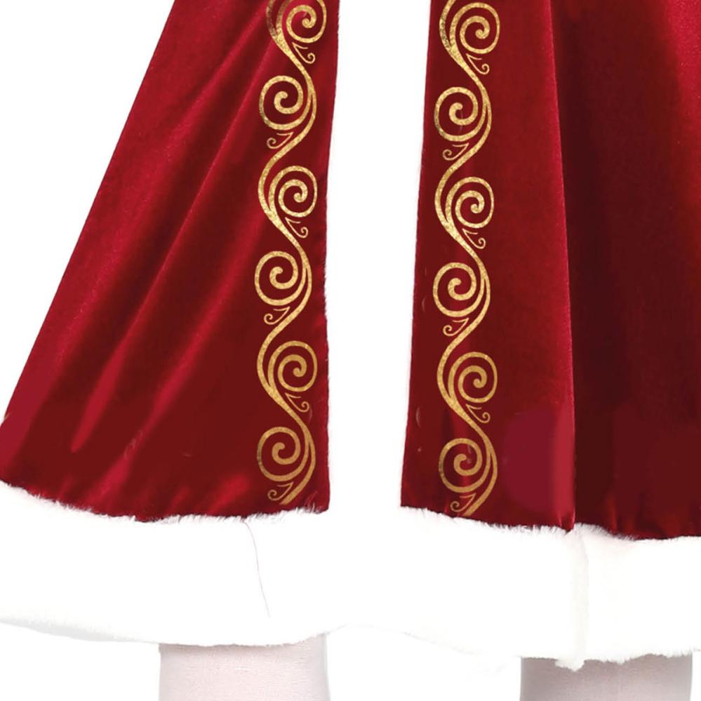 Nissemor Julekostyme Mørkerød Barn er et barnekostyme med julemotiv i mørkerødt og hvitt. Drakten inneholder en kort kjole med gullfargede detaljer, et svart midjebelte med gullspenne og en nisselue.