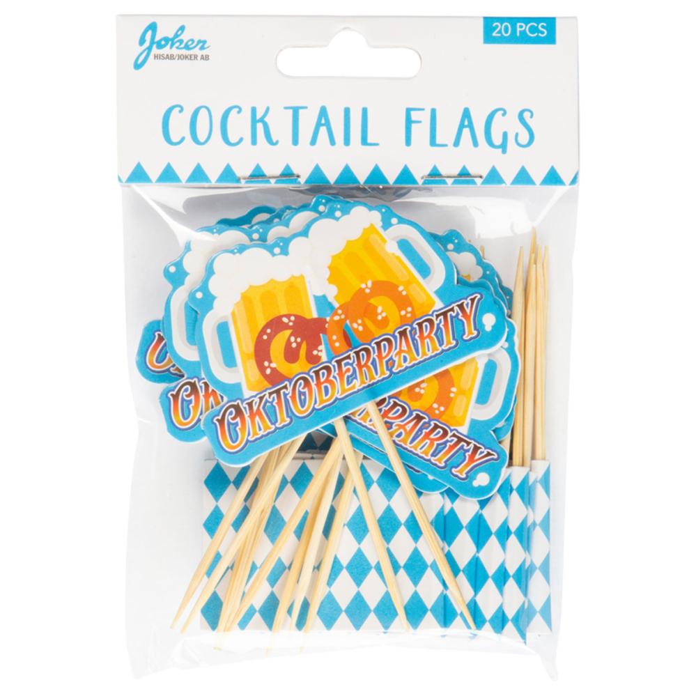 Oktoberfest Cocktailpinner 20-pakning inneholder tjue trepinner hvorav ti har bayerske flagg og ti har skilt som er dekorert med ølkrus, kringler samt teksten ”OKTOBERPARTY”.