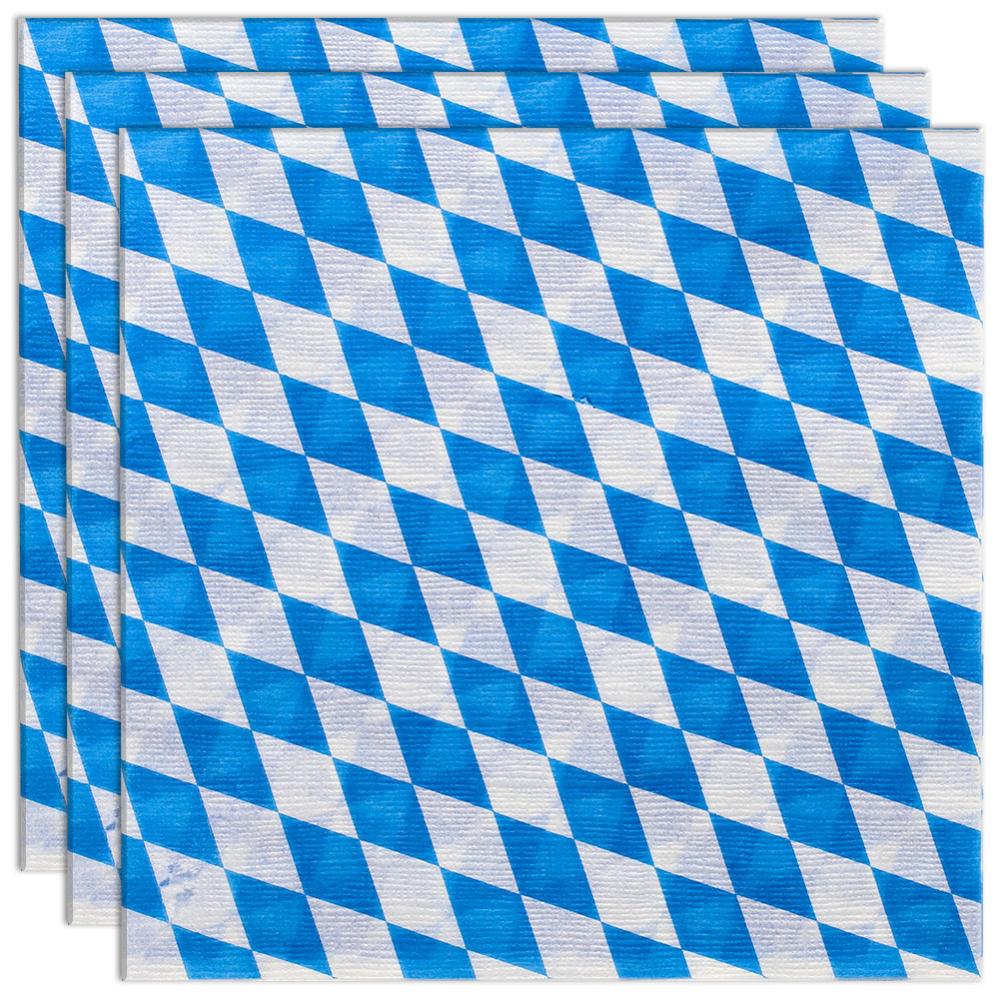 Oktoberfest Engangsservietter Bayersk 100-pakning inneholder hundre papirservietter i bayersk mønster med hvite og blå romber.