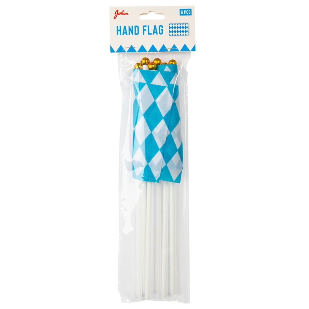 Oktoberfest Håndflagg Bayersk 6-pakning inneholder seks håndflagg med bayersk mønster i blått og hvitt. Hvert flagg har en hvit flaggstang med en skimrende gullfarget flaggstangknopp i form av en kule.