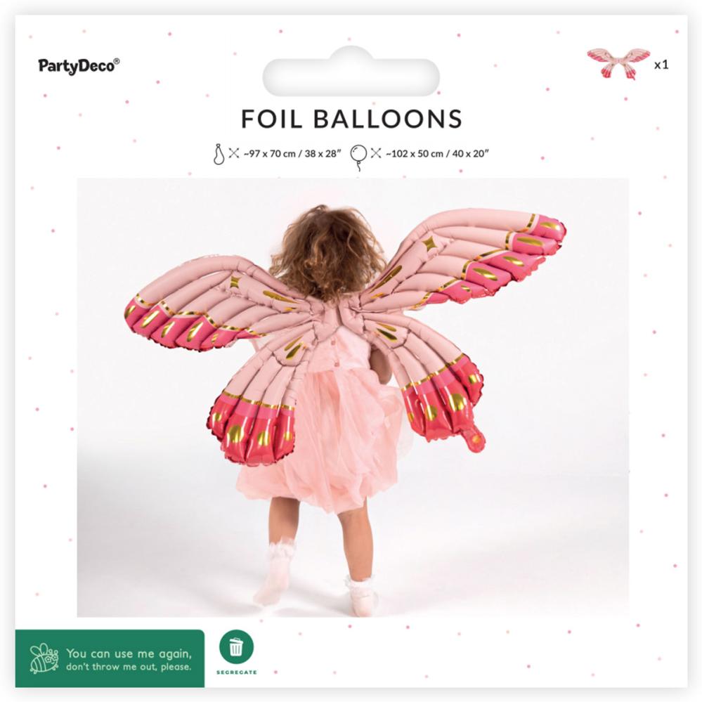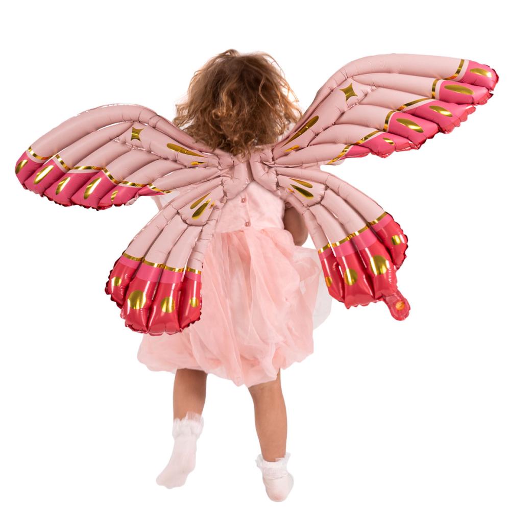 Oppblåsbare Sommerfuglvinger Rosa omfatter en folieballong i form av sommerfuglvinger i en matt rosa nyanse med gyldne detaljer. Ballongen kan festes på ryggen eller brukes som en vanlig ballong. Medfølger sugerør for å blåse opp folieballongen.
